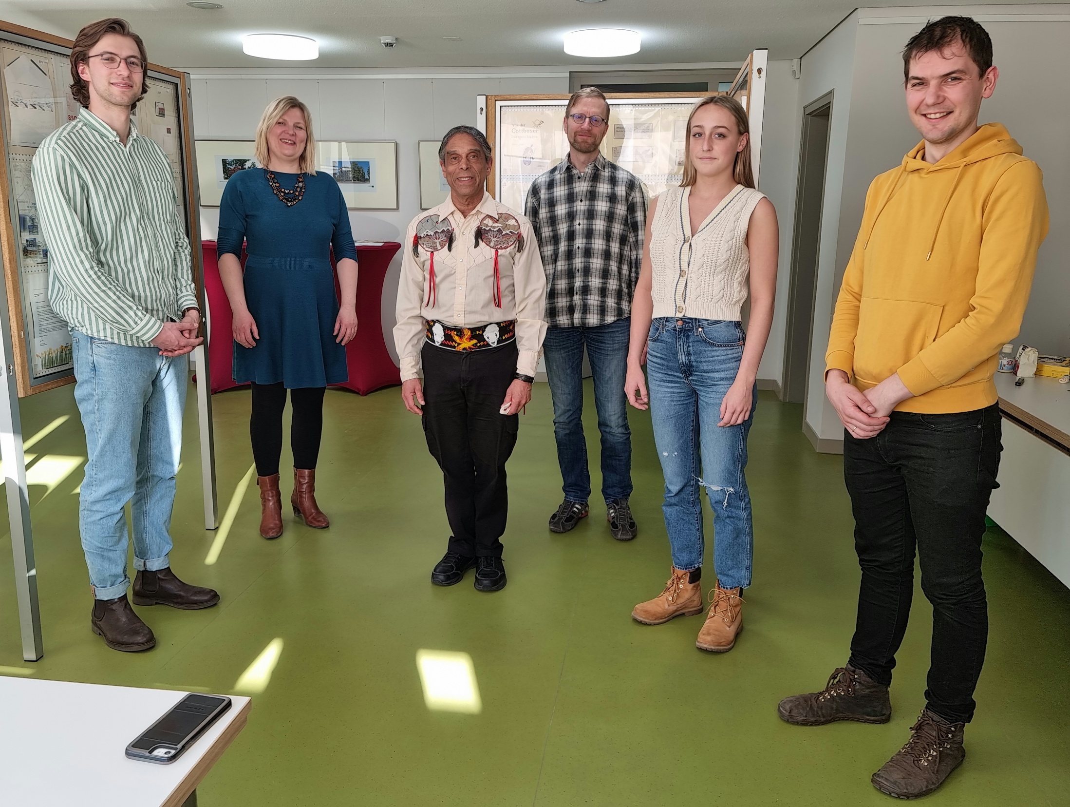 Bild 1: Die Mitinitiatoren des Projekts „Zorja ” Maximilian Hassatzky (links) und Gregor Kliem (rechts), Prof. Dr. Neyooxet Greymorning (Mitte), Katrin Suchy-Zieschwauck, Bernd Melcher und Shay Sullivan (v.l.),
