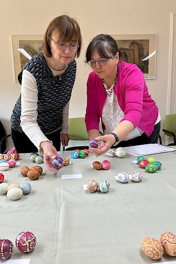Ćežki nadawk matej dźensa Andrea Pawlikowa a Sonja Hrjehorjowa (wotlěwa). Wonej stej jurorce, kotrejž wuzwolitej mjez 77 zapodatych kolekcijow jejkow (14 wjac hač loni) najrjeńše serbske jutrowne jejko we wubědźowanju za dźěći a młodostnych. Młodźi wuměłcy mjez štyri do 24 lět zapodachu swoje kreacije w regionalnych běrowach Domowiny abo w Serbskimaj kulturnymaj informacijomaj w Budyšinje a Choćebuzu. Hłownje pochadźeja z Łužicy, ale tež w Podstupimje, Drježdźanach abo w Jenje běchu dźěći a młodostni pilni a kreatiwni. Jury hódnoći jejka po wšelakich kriterijach. Wuměłcy jejkow su při tym anonymni. Štó budu ći dobyćerjo, to zhoni zjawnosć w běhu přichodneho tydźenja. Zarjadowar projekta je Spěchowanski kruh za serbsku ludowu kulturu z.t. Projektny management Domowiny projekt podpěruje. Załožba za serbski lud jón spěchuje.