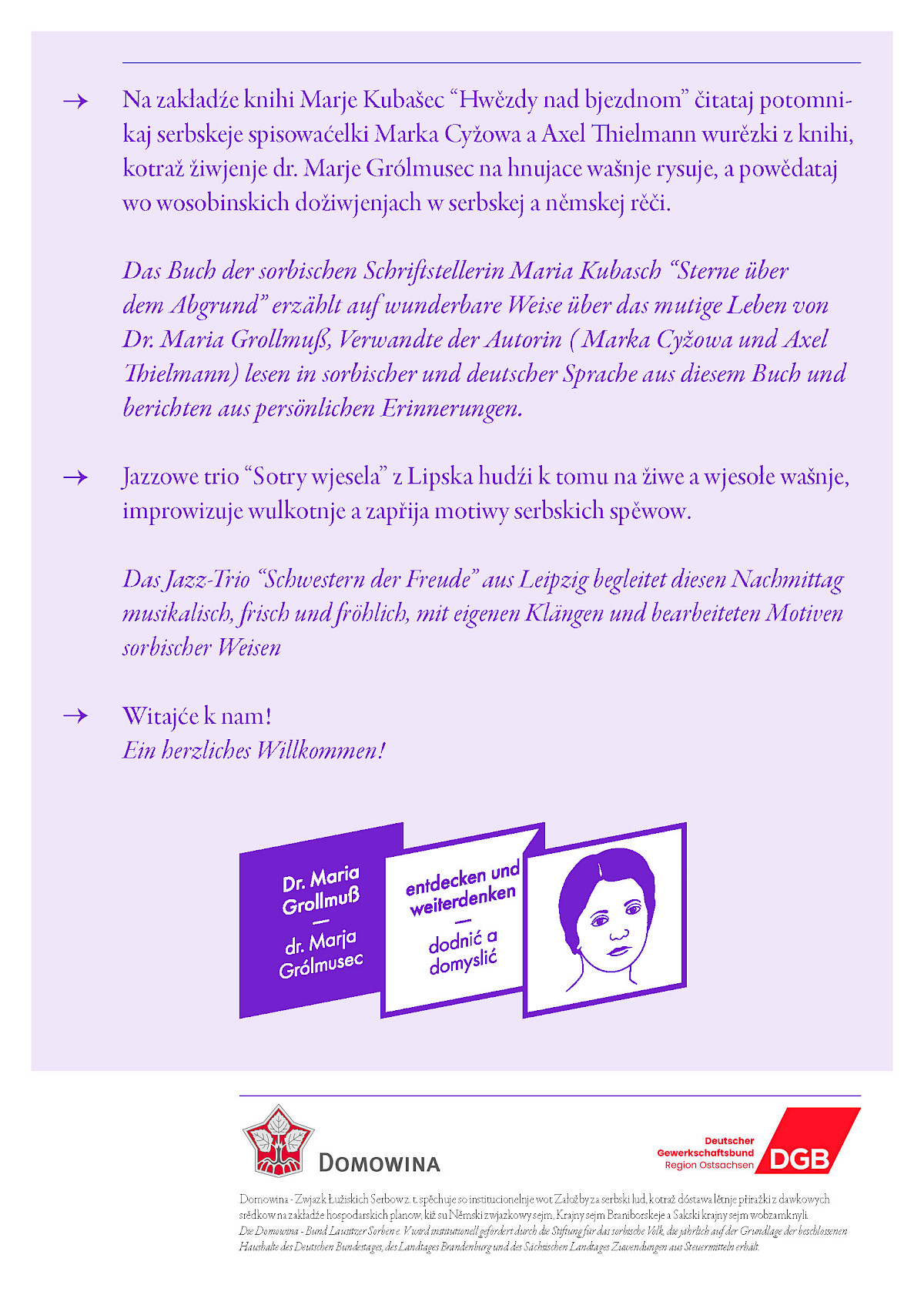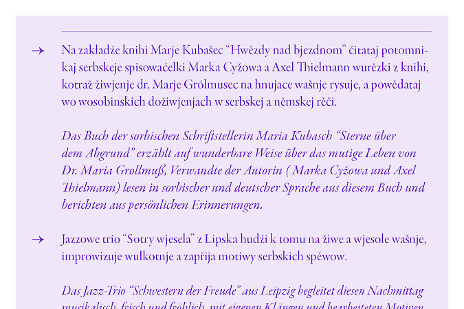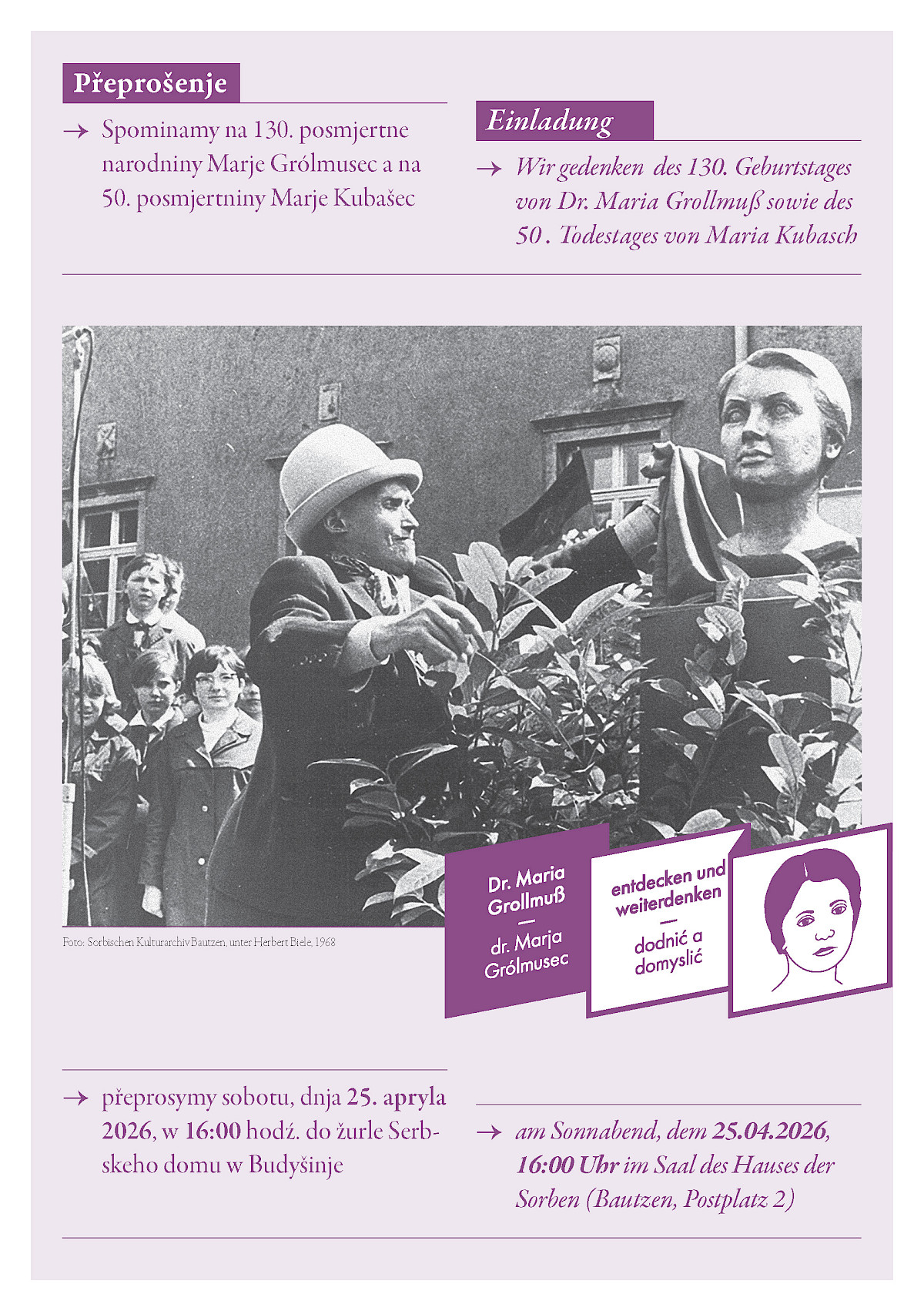 16:00 hodź. hudźbno-literarne popołdnjo składnostnje 130. narodninow dr. Marje Grólmusec a 50. Posmjertninow Marje Kubašec na žurli Serbskeho domu w Budyšinje (informacije hlej lětak)