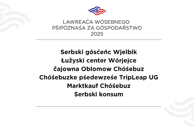 Außerdem erhielten folgende Vorhaben "Anerkennung für die Förderung des Sorbischen in der Wirtschaft": Sorbisches Restaurant Wjelbik in Budyšin | Bautzen Lausitzcenter Wojerecy | Hoyerswerda Oblomow Tee in Chóśebuz | Cottbus TripLeap UG in Chóśebuz | Cottbus Marktkauf Chóśebuz | Cottbus Laden für sorbische Accessoires SerbskiKonsum