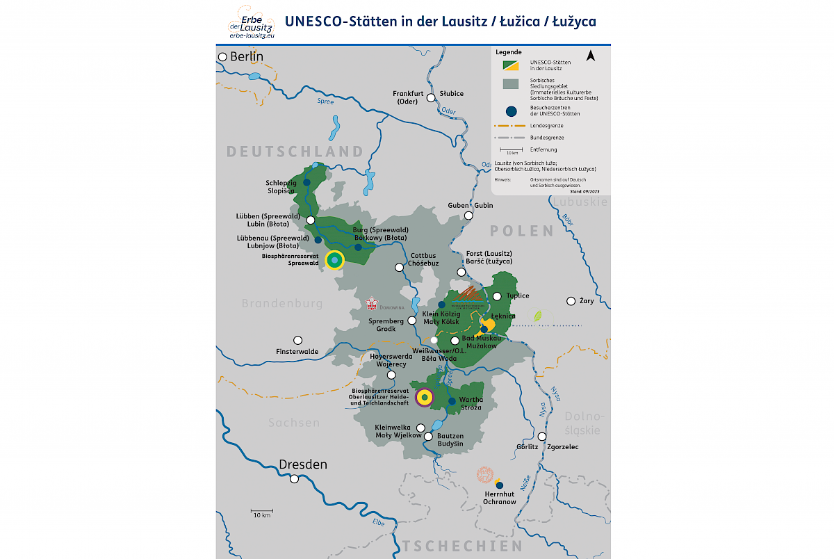 In der Lausitz befinden sich vier UNESCO-geschützte Stätten: das Biosphärenreservat Spreewald, die Oberlausitzer Heide- und Teichlandschaft, der Global Geopark Muskauer Faltenbogen und das Welterbe Muskauer Park. Zusammen mit dem immateriellen Kulturerbe der Sorben bildet dies eine weltweit einzigartige Konzentration von Landschaften mit einem UNESCO-Status.