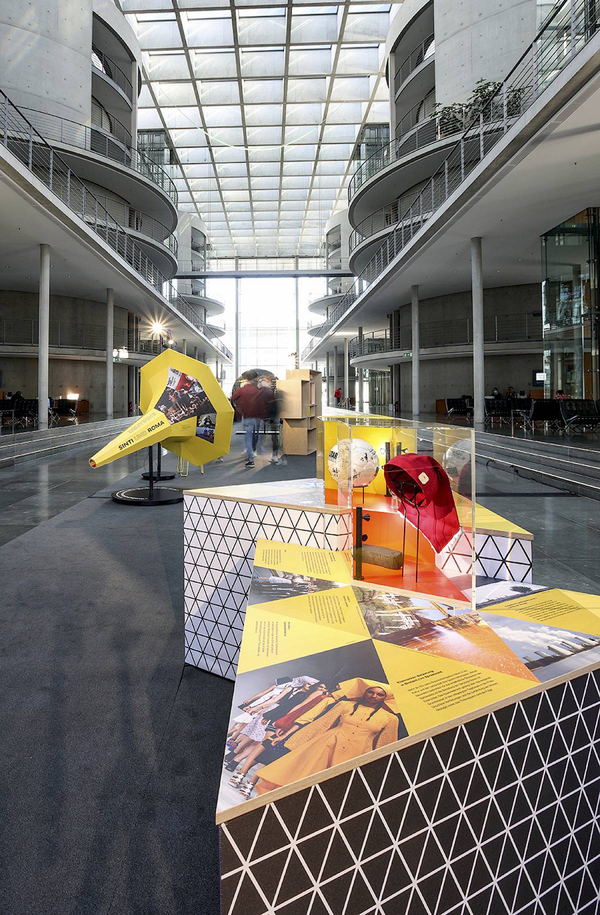 Das sorbische Ausstellungselement greift in seiner Dreiecksform zentrale Motive der sorbischen Volkskunst auf – inspiriert von traditionellen Trachten und den Ornamenten sorbischer Ostereier. Die Zweiteilung symbolisiert die beiden sorbischen Sprachen und das auf Ober- und Niederlausitz verteilte Siedlungsgebiet. Foto: Minderheitensekretariat/Stefan Haehnel