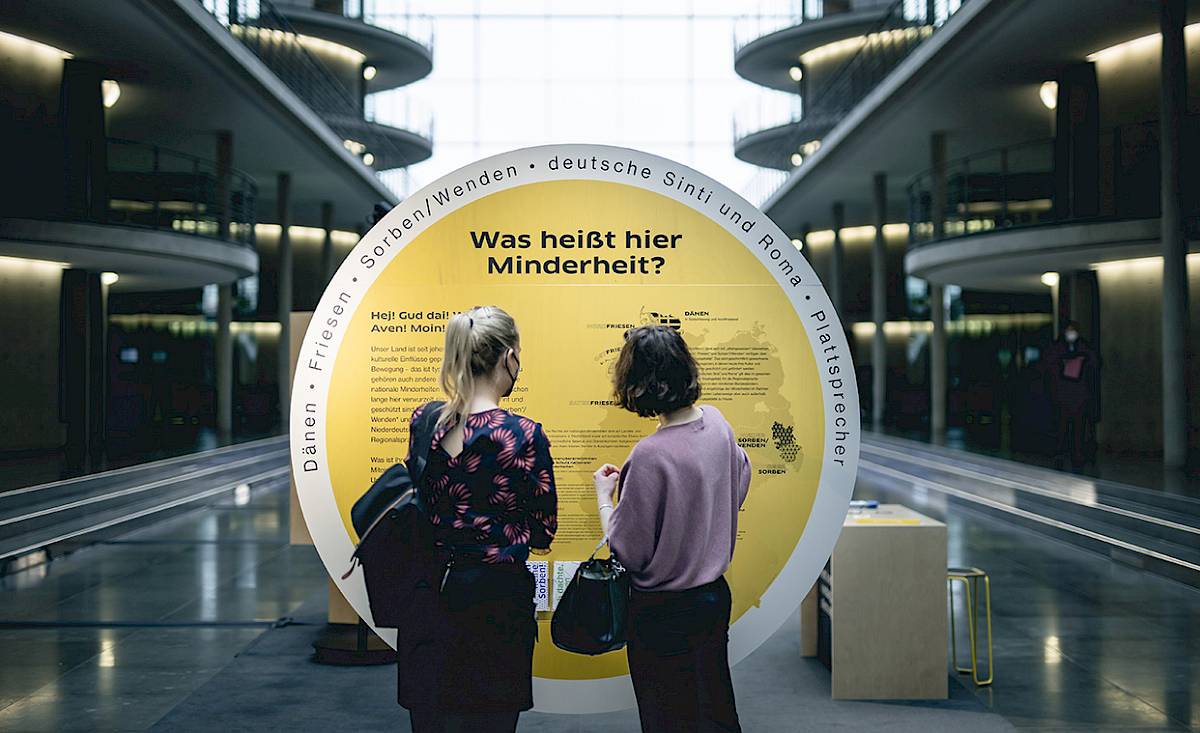 Die Wanderausstellung „Was heißt hier Minderheit?“ zeigt erstmals gemeinsam die vier nationalen Minderheiten Deutschlands – Dänen, Friesen, Sorben/Wenden und deutsche Sinti und Roma – sowie die Sprechergruppe Niederdeutsch. Sie macht ihre Geschichte, Sprache und Kultur sichtbar und wurde im März 2022 im Deutschen Bundestag eröffnet.
