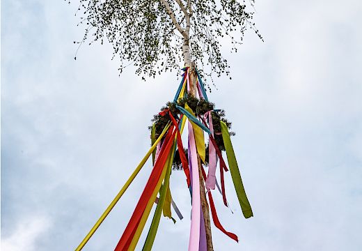 Der Maibaum wird auf dem Dorfplatz von der Jugend aufgestellt.