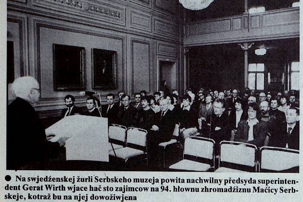 Erste Hauptversammlung nach der Wiederbelebung der Maćica Serbska in Bautzen mit der Wahl eines Vorstandes und Vorsitzenden sowie der Annahme der Vereinssatzung