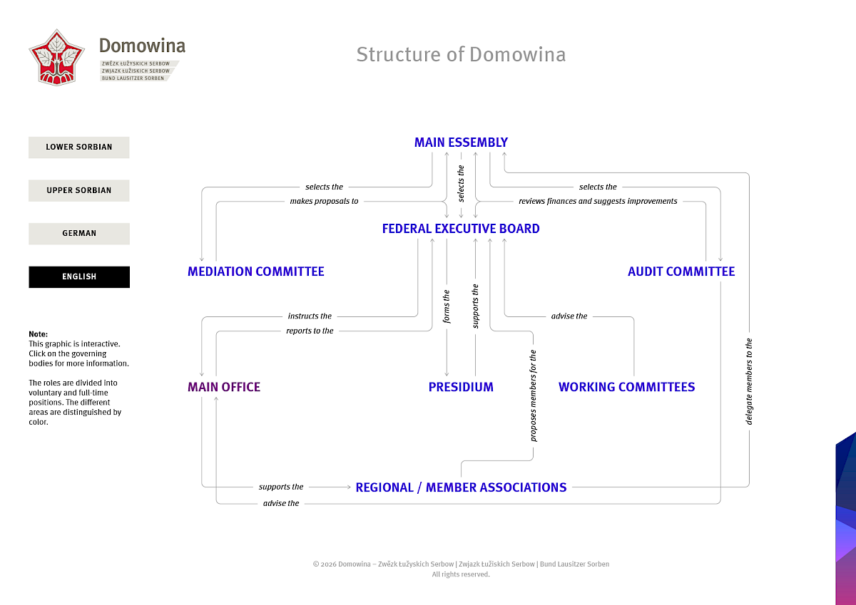 Domowina wažy sebje sobustatkowanje a cesnoamtski angažement swójich cłonkow a cłonkow. Zgromadnje zasajźujomy se za zachowanje a spěchowanje serbskeje rěcy a kultury.