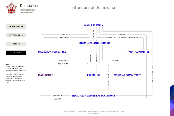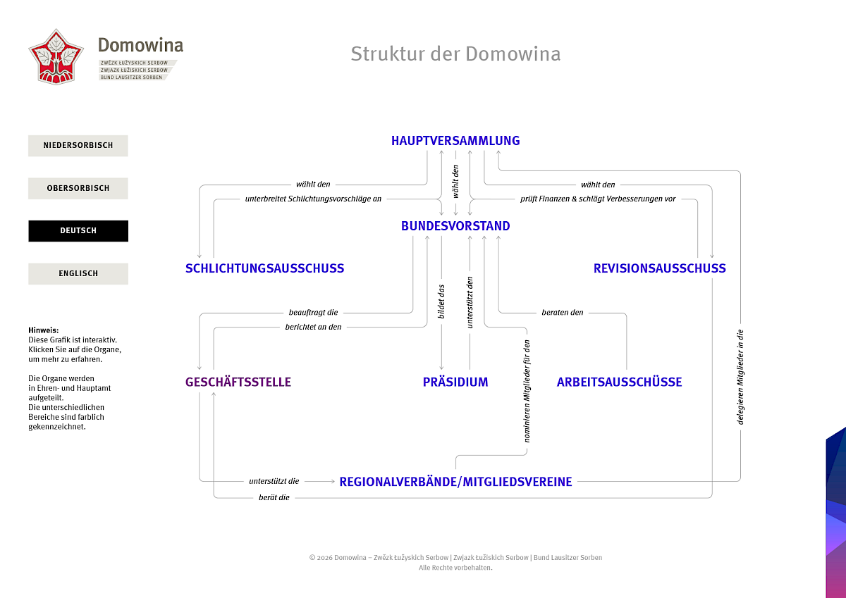Źěło Domowiny póstajaju demokratija, zagronitosć a angažement. Naše gremije wugótuju pśichod serbskego luda, twórje rozsudy a zasajźuju se za zachowanje a wuwiśe serbšćiny.