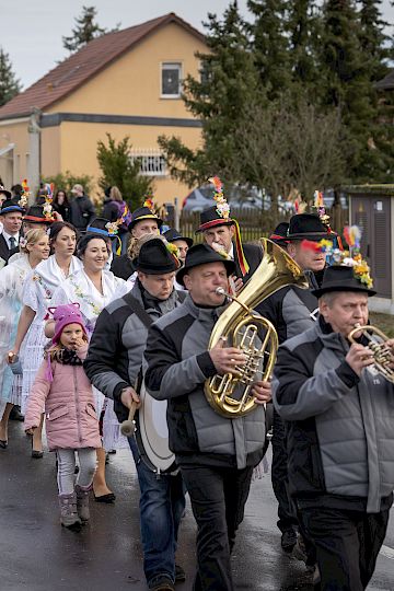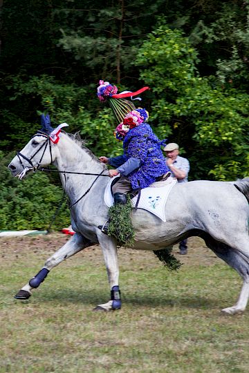 Swěźeński woblacone muske w carnem kamzolu a z cylindrom na wupyšenych kónjach rejtuju. W kuždem ze źewjeś procesionow njasu wóni chórgoje, kśicu a póstawu Zrowastanjonego w procesionje. Kjarliže spiwajucy a se módlecy rejtuju jatšowne rejtarje do susedneje wósady a radostne pósołstwo wó zrowastanjenju Jezusa Chrystusa wózjawjuju.