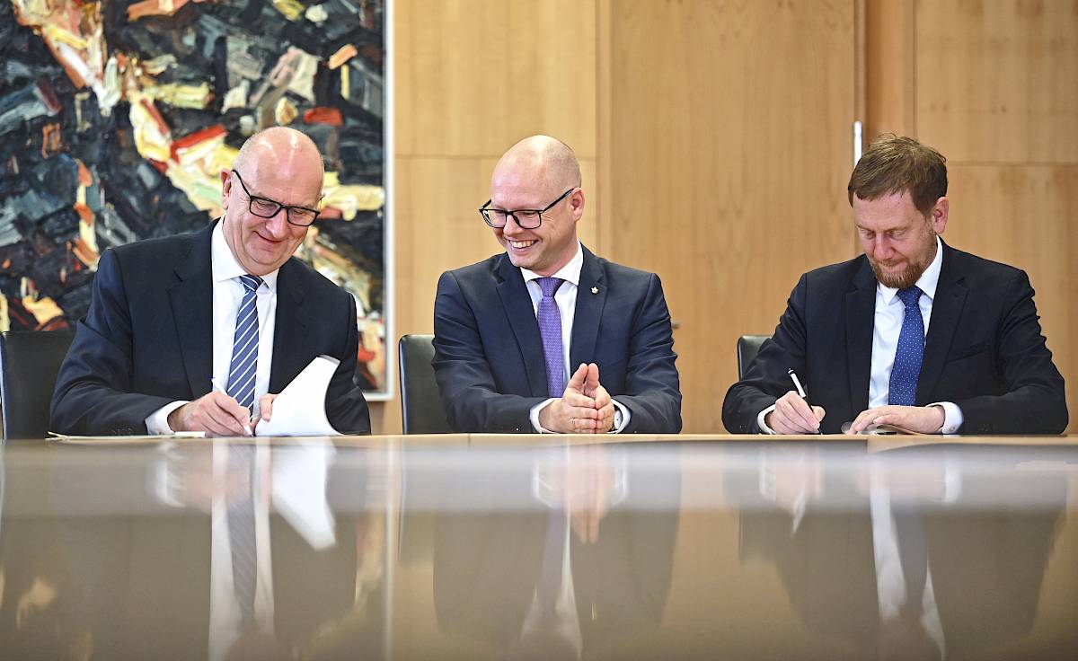 Joint commitment: Brandenburg’s Minister-President Dietmar Woidke and Saxony’s Minister-President Michael Kretschmer call for long-term funding of the Foundation for the Sorbian People, initiated by Domowina Chair Dawid Statnik in 2025. Photo: Katharina Kausche.