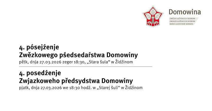 Wutrobnje přeprošujemy na 4. rjadne posedźenje Zwjazkoweho předsydstwa Domowiny pjatk, 27.03., we 18.30 hodź. na žurli Wobydlerskeho domu „Stara šula“ w Židźinom. Sćěhowace temy steja mj. dr. na dnjowym porjedźe: